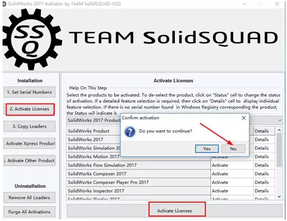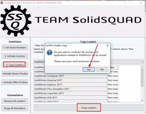15.继续以管理员的身份运行SW.Activator,点击 “Copy Loaders”项,点击下方“Copy Loaders”,点击Yes;